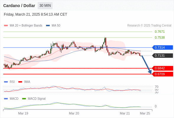 备选策略: 如突破 0.7314 ,Cardano / Dollar 目标方向为 0.7538 和 0.7671 。