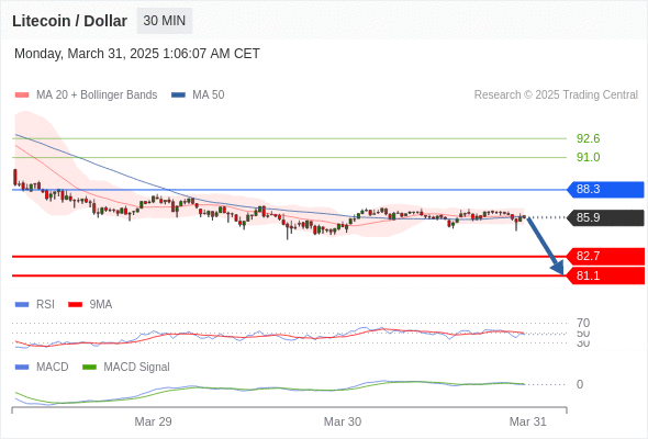 备选策略: 如突破 88.3 ,Litecoin / Dollar 目标方向为 91 和 92.6 。